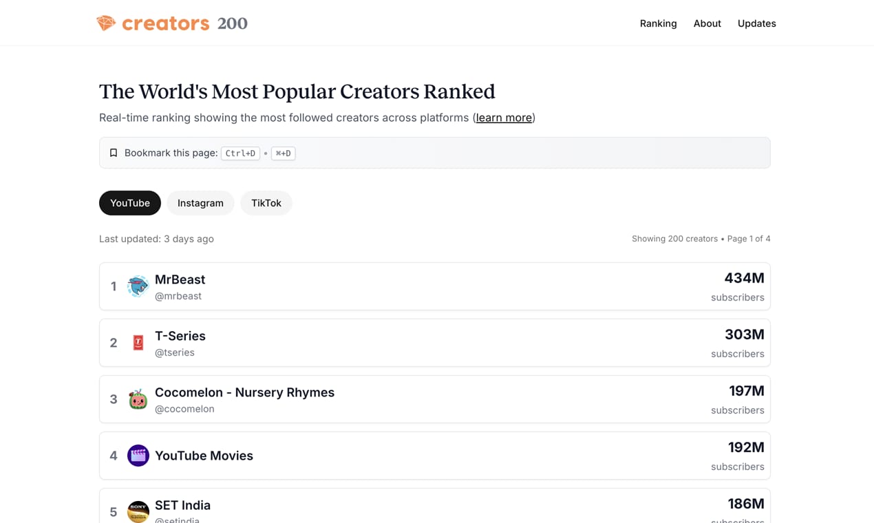 So, I made a simple site that tracks the top 200 creators globally. Think of it as a kind of Forbes List for Creators.