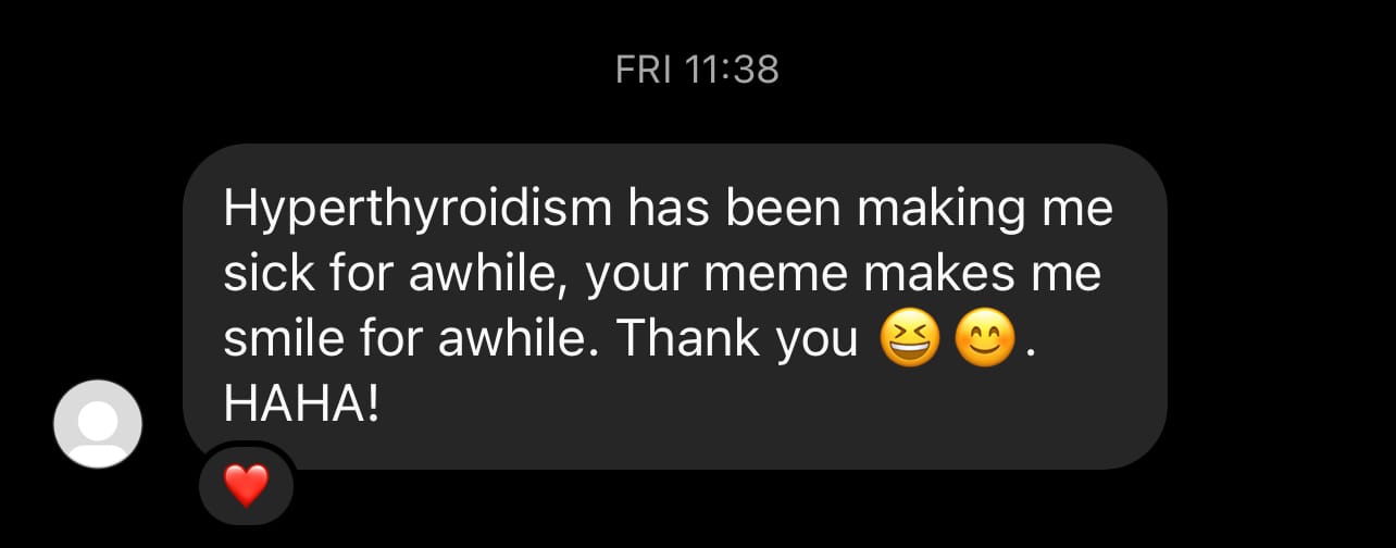 Many people laughed at me, some were angry at me, but most, I’m thankful to say, have said it made their lives better in some little way. Typical messages I received were laughing with me, and that‘s great. I even got some touching messages like this one: